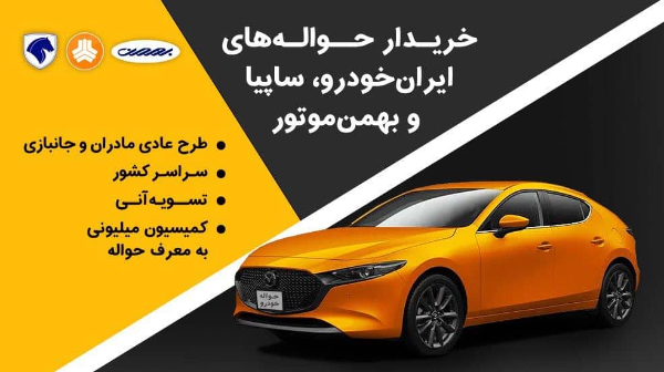خریدار حواله خودرو شما هستیم. با اطمینان خاطر حواله خود را ب ما بسپارید. ایرانخودرو (دنا،تارا،سورن، رانا، هایما، ری را) بهمن موتور (فیدلیتی،رسپکت) سایپا(سایناکوییک شاهین) حواله خودرو وارداتی جانبازی برای اطلاع از قیمت تماس بگیرید بالاترین قیمت خریدارم محضری و قانونی تسویه آنی برای برقراری ارتباط بر روي شماره تماس کلیک کنید.